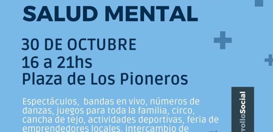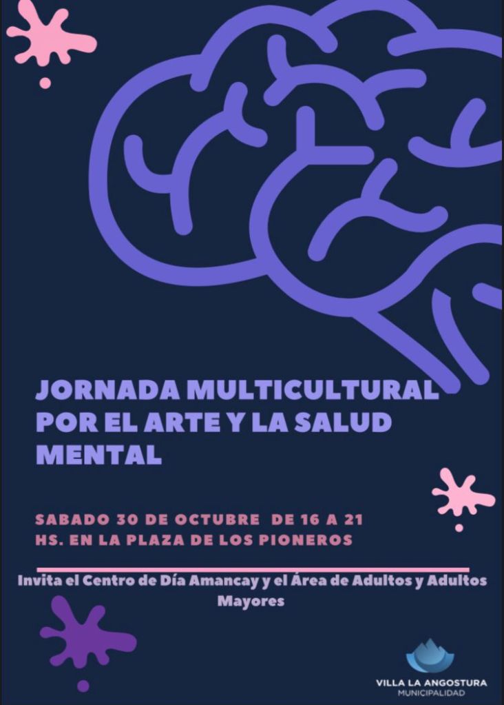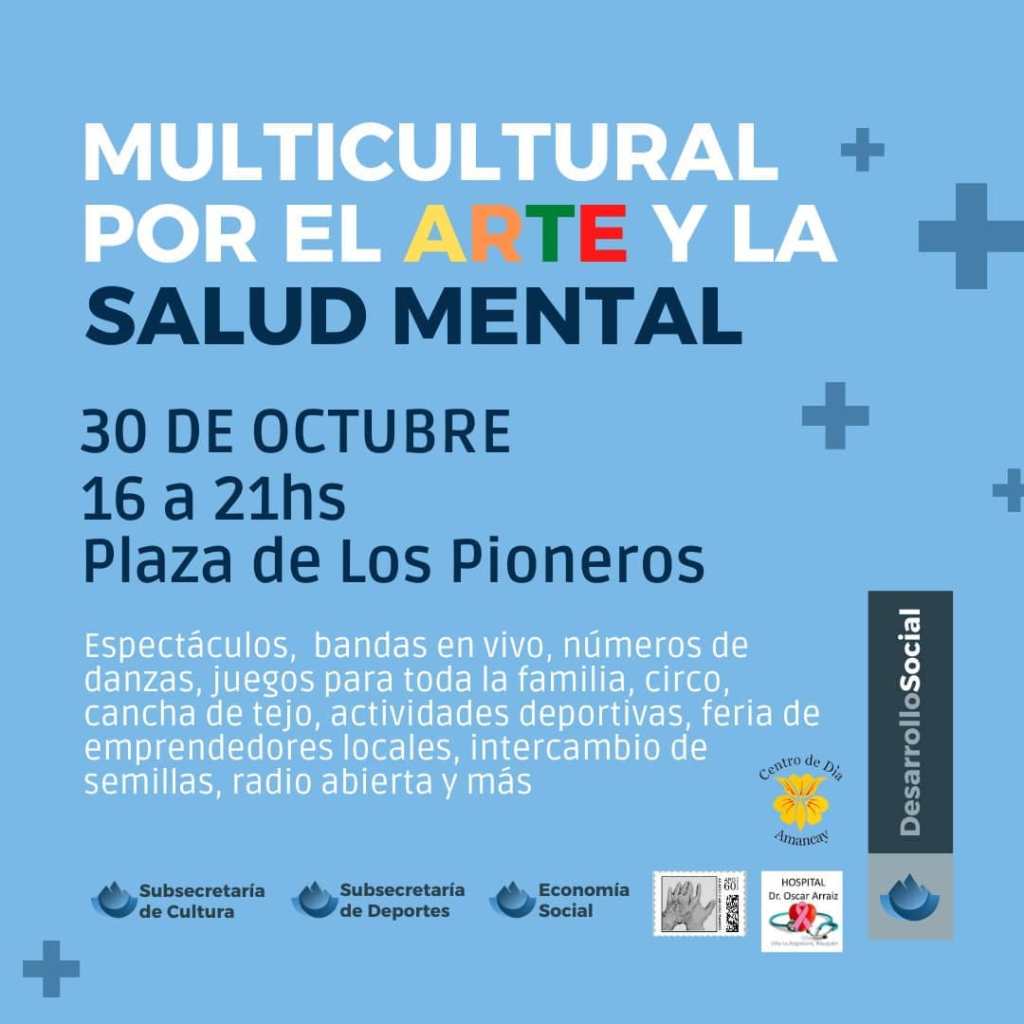 El sábado 30 a partir de las 16 y hasta las 21 en la plaza de los pioneros se realizara la jornada Multicultural por el Arte y la Salud mental, en el marco del mes de la Salud Mental, el Centro de Día Amancay y el Área de Adultos y Adultas Mayores, impulsan esta jornada.