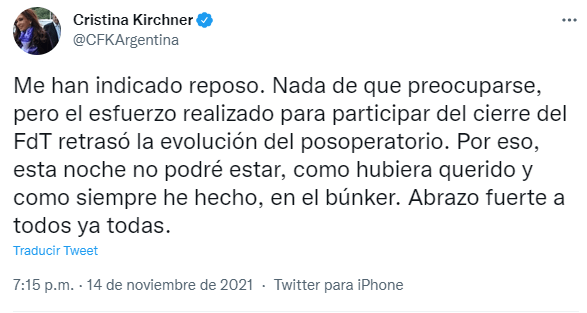 En un twitt la ex presidenta anuncio que debido a su recuperación post operatoria y el esfuerzo realizado en el cierre de campaña, no asistirá al bunker del Frente de Todos.
