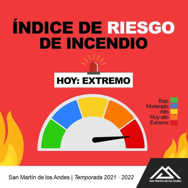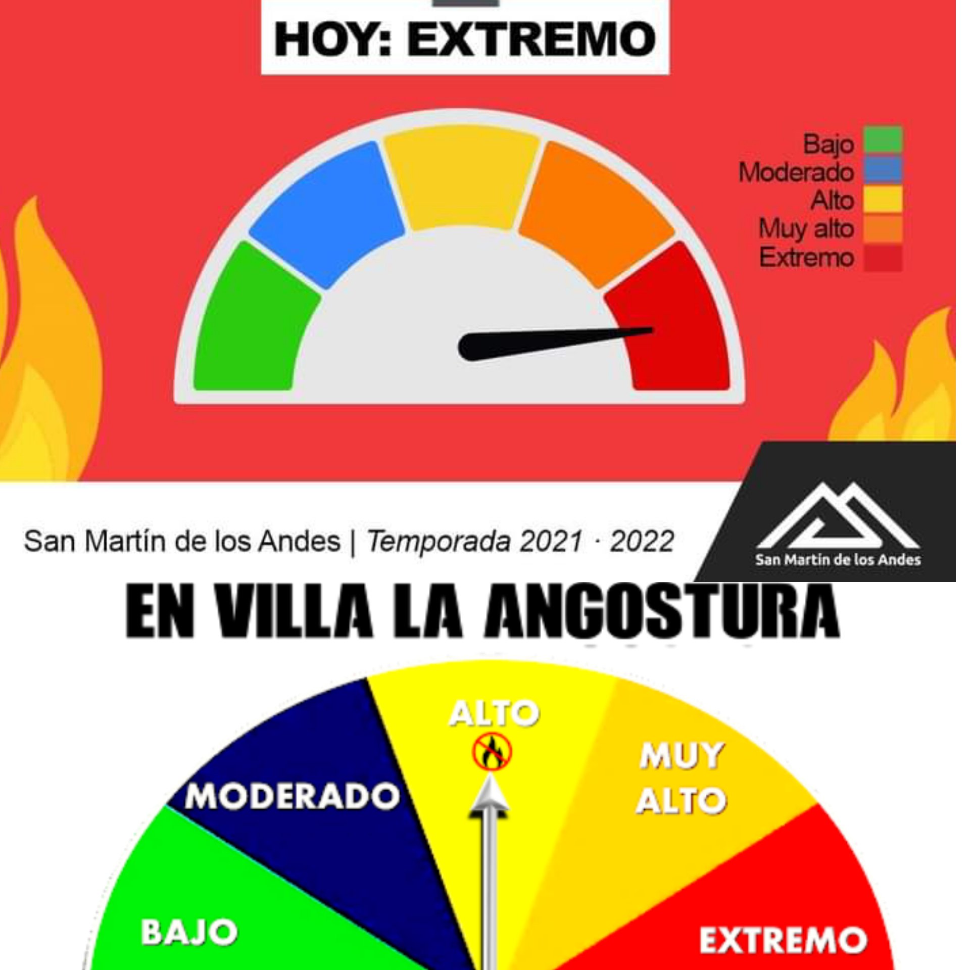 En el Caso de San Martin de los Andes cambio a las 12.00 AM de MUY ALTO a EXTREMO, Villa la Angostura la evaluación al Momento es de Riesgo ALTO, pero la situación es evaluada por personal de la brigada de incendios forestales y salvo alguna emergencia es actualizada a las 14 hs todos los días, y publicada por la gente de la Dirección de Protección Civil de Villa la Angostura.