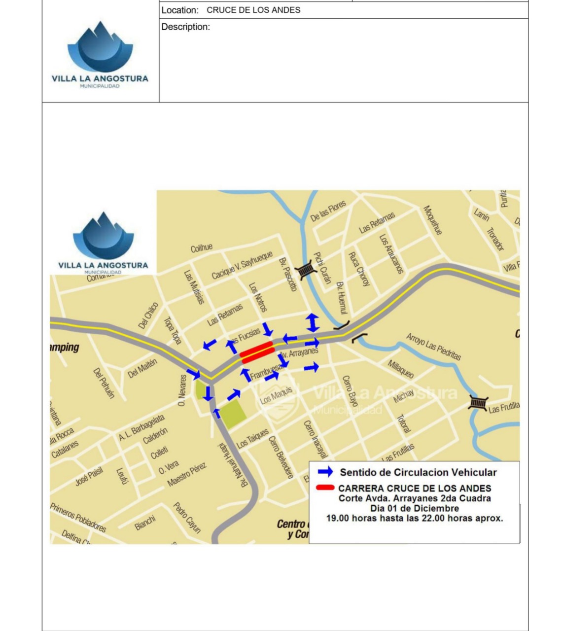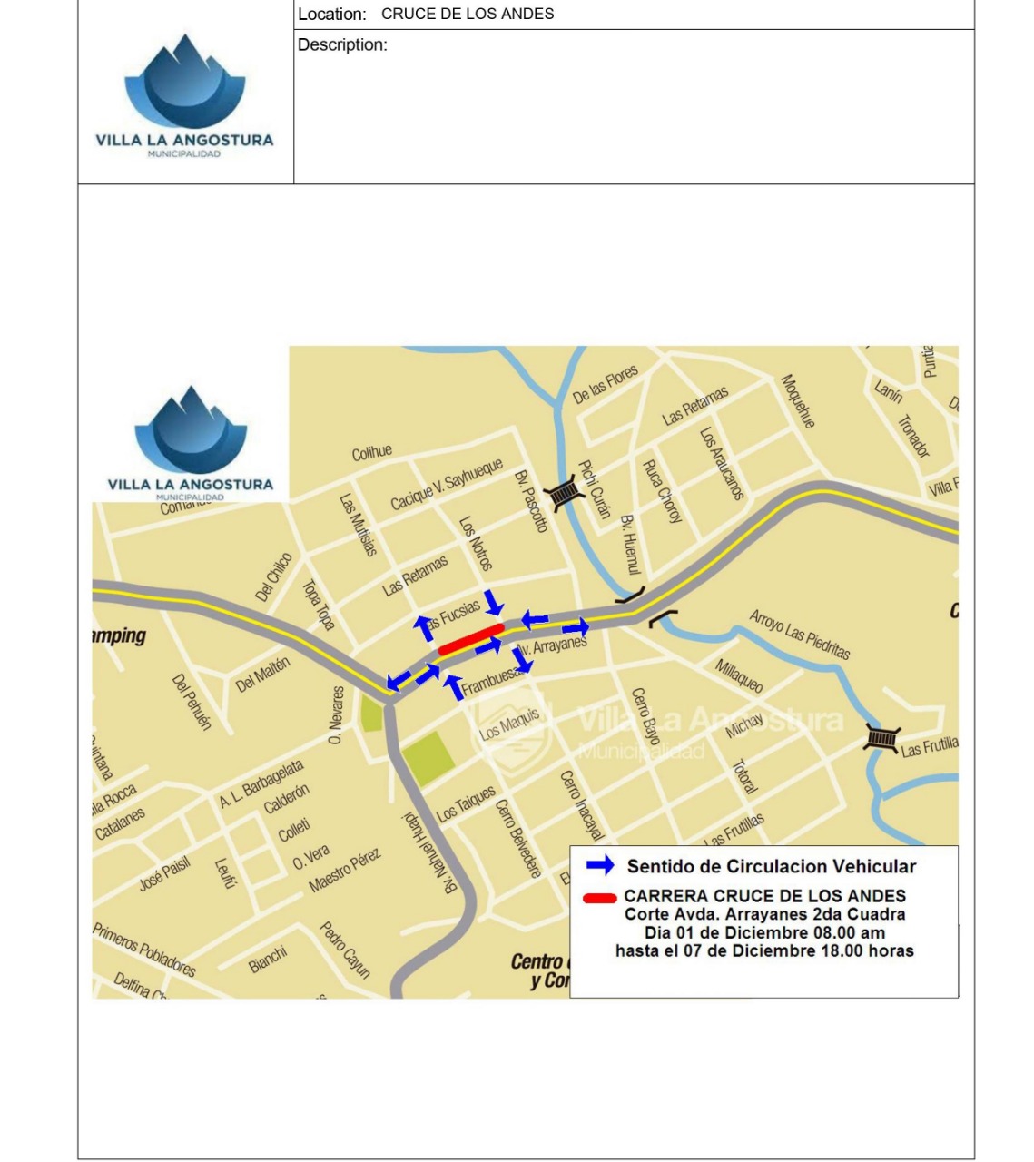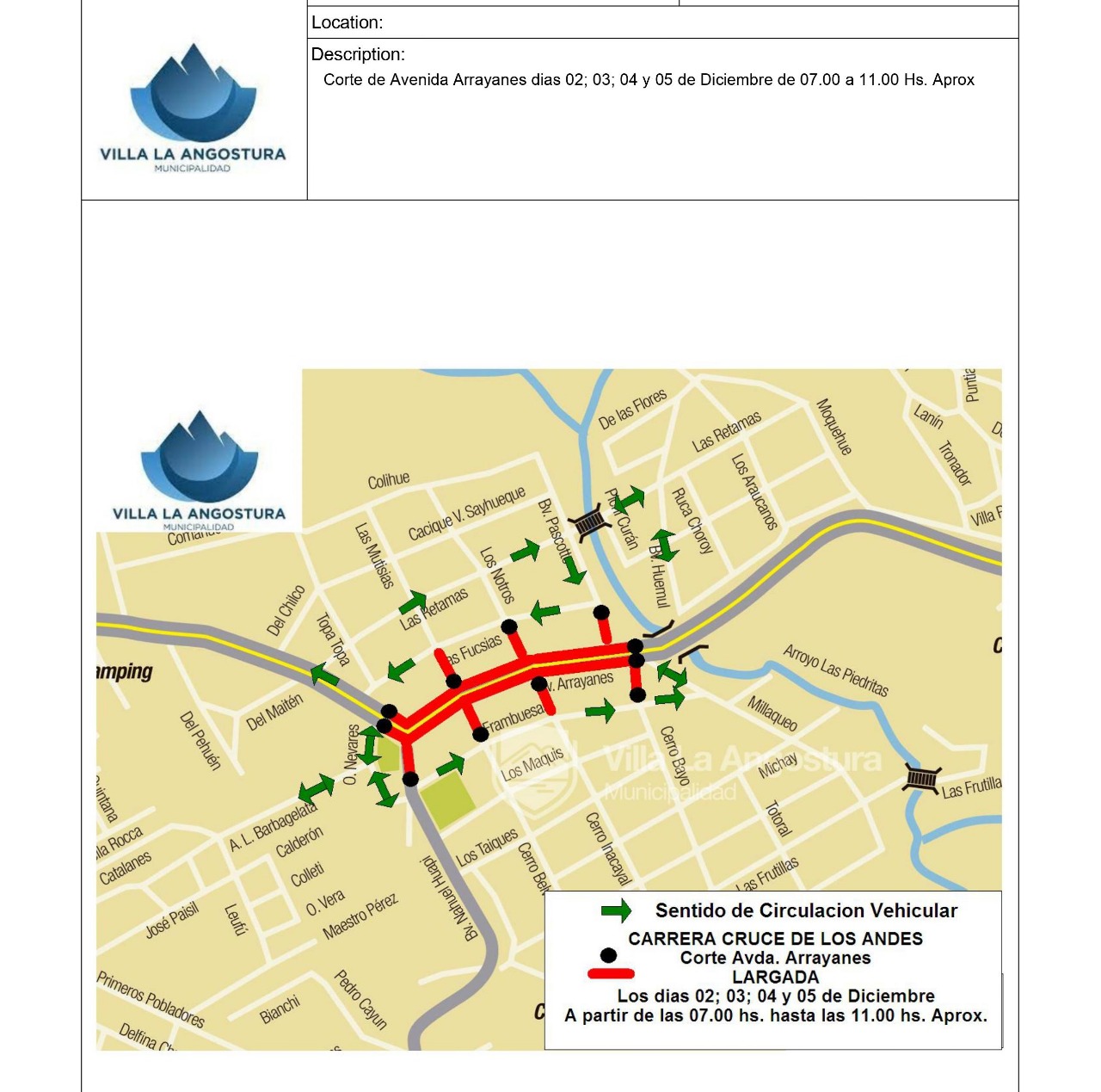 Segunda cuadra avenida Arrayanes mano hacia 7 lagos, desde el 1 de 8 AM hasta el 7 de diciembre inclusive a las 18.00 hs.
