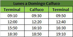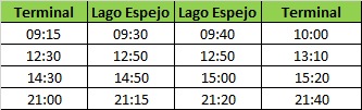 Saliendo de la terminal de Ómnibus de la localidad a las 9.15 hs a las 12.30, 14.30 y 21 hs. Y retornando desde el espejo a las 9.40 hs, 12.50, 14.50 y el ultimo colectivo que vuelve a Angostura, sale del espejo a las 21.15 hs.