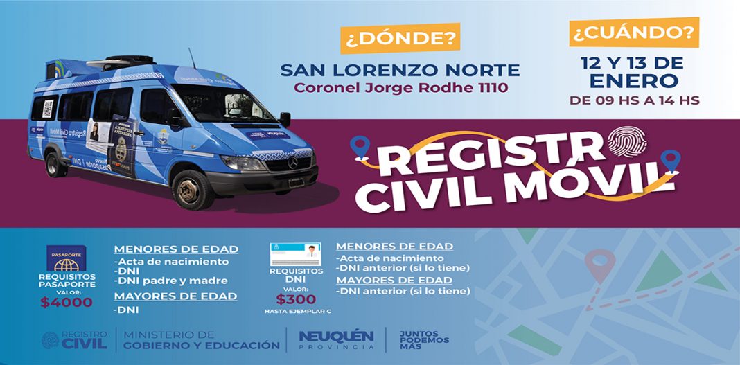 El vehículo que acerca los trámites civiles a la comunidad estará presente en el barrio San Lorenzo Norte los días miércoles 12 y jueves 13 frente al Registro Civil Nº 5 ubicado en Coronel Jorge Rodhe Nº 1110. Desde las 9 hasta las 14 hs se podrán realizar los trámites de DNI para mayores y menores de edad, con el requisito de llevar el acta de nacimiento y el DNI de los progenitores en el caso de los menores de edad. En el Registro Civil Móvil también se podrá realizar el trámite para la obtención del pasaporte.