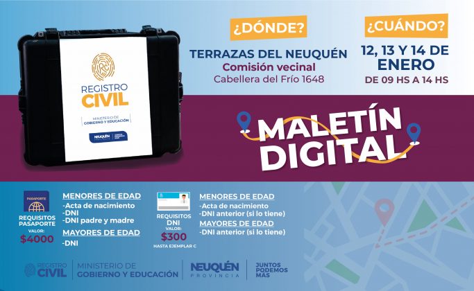 Por otro lado, llegará el servicio del Maletín a Terrazas del Neuquén y al Centro Oeste de la capital neuquina. El maletín móvil que llega a cada barrio estará presente los días miércoles 12, jueves 13 y viernes 14 en la Comisión Vecinal de Terrazas del Neuquén ubicada en Cabellera del Frío Nº 1648.