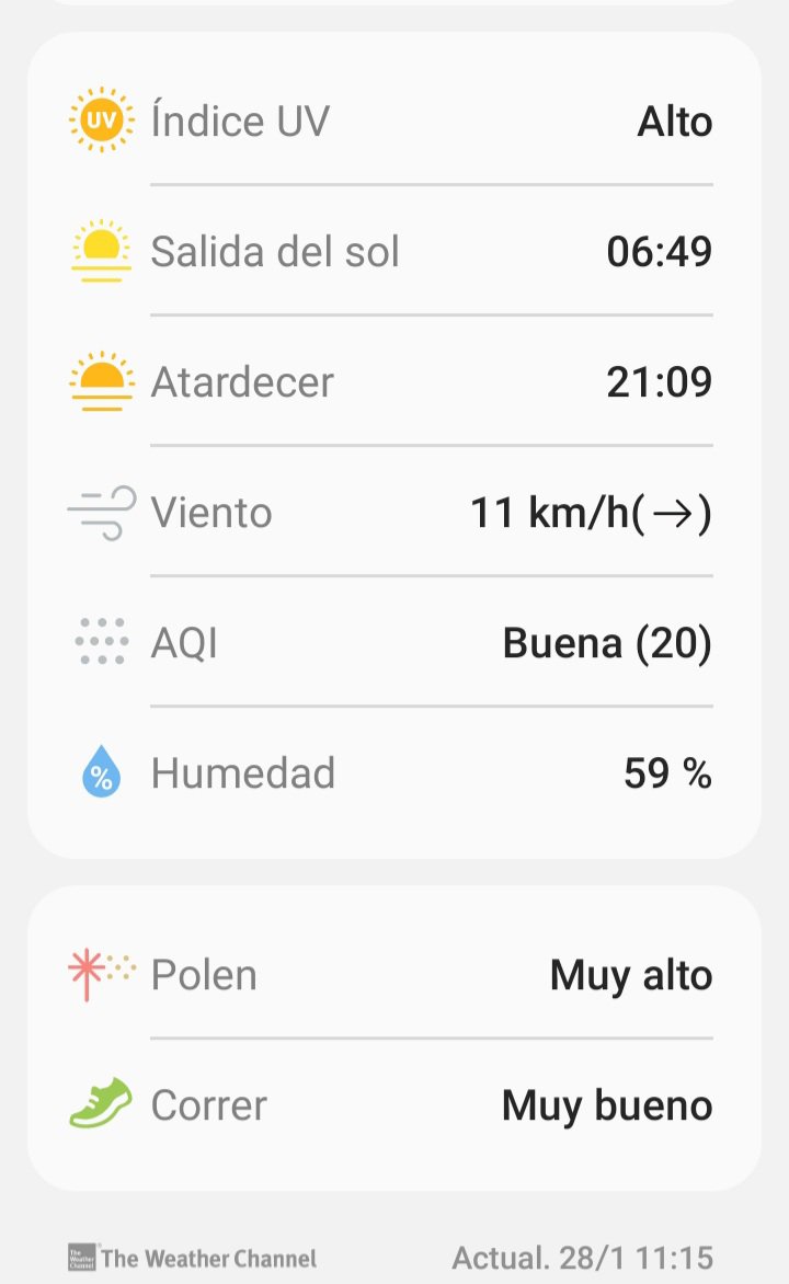 El polen muy alto marcado en la atmosfera y las condiciones para correr o caminar son muy buenas, los rayos UV a esta hora aparecen como riesgo ALTO y se espera que para el medio día solar eleve a extremo, asique como siempre decimos ponerse protector solar al aire libre es muy importante.