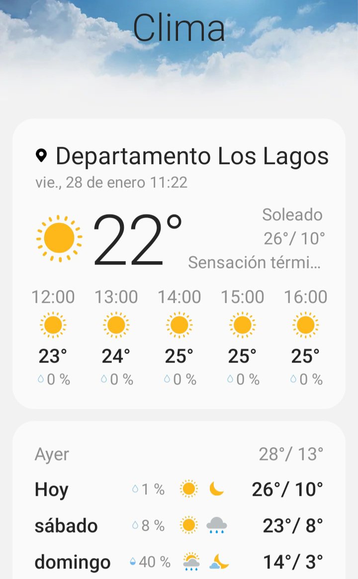 Viernes 28 de enero ya estamos a las puertas del fin de semana. La mañana totalmente soleada y calurosa nos marca en el termómetro unos 22 grados ya a las 11 AM, y la máxima para hoy es de 26 grados.