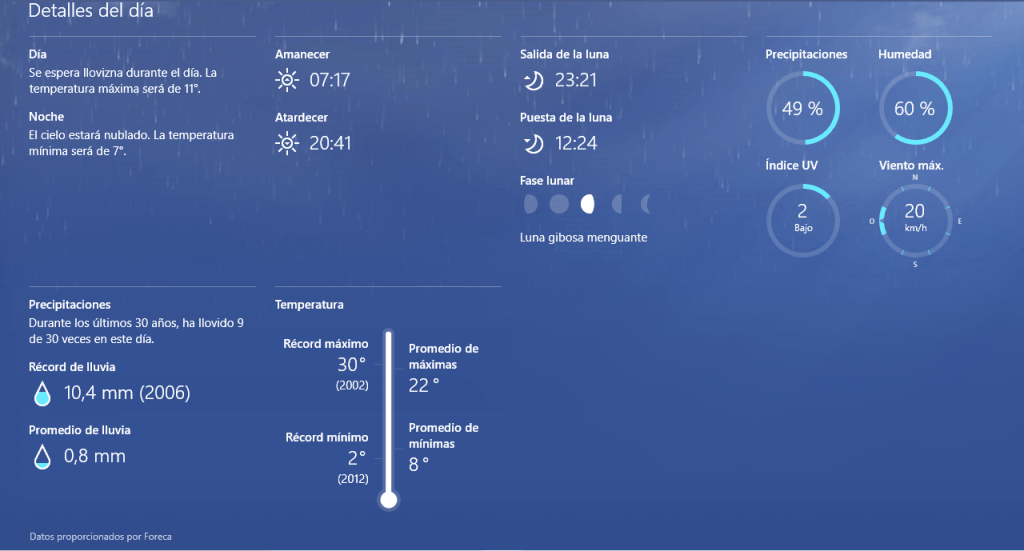 La máxima pronosticada para hoy no supera los 11 Grados. Asique llevar siempre algo de abrigo y si vamos a salir llevar algo que pare la lluvia.