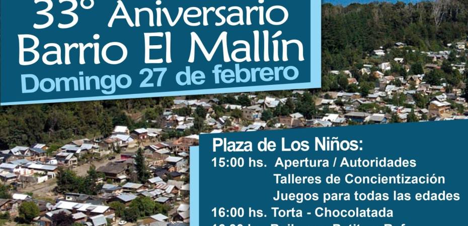 Este domingo 27 de febrero a partir de las 15 horas en la Plaza de los Niños, el barrio Mallín tendrá una gran celebración por su 33° aniversario, acompañado de espectáculos, show y atracciones para toda la familia, ENTRADA LIBRE Y GRATUITA!
