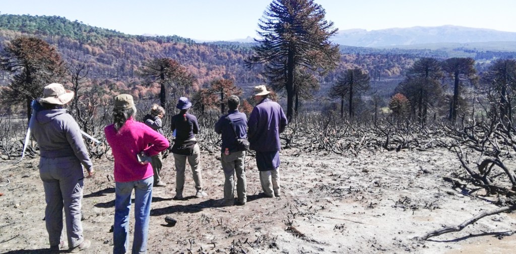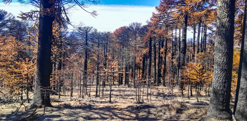 “Las araucarias afectadas presentaron una categorización más diversa. Reconocimos tres tipos de árboles afectados: ‘araucarias chamuscadas’, que presentan parte de la copa sin quemar; ‘araucarias quemadas con yemas verdes’, totalmente quemadas, con el follaje quemado aún retenido sobre las ramas y con la particularidad de presentar yemas verdes en los extremos de las ramas; ‘araucarias calcinadas’, sin retención de follaje y sin yemas verdes, y en muchos casos con presencia de un exudado resinoso por los troncos”, se indicó.