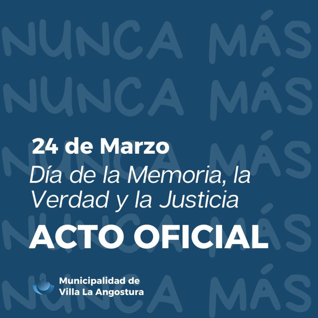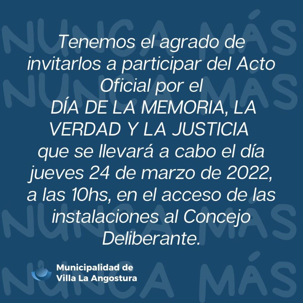 22 de marzo, 2022 Opinión a Diario Actividad oficial por el día Nacional de la Memoria por la Verdad y Justicia. El acto oficial será el 24 de Marzo a las 10 hs, en el acceso al Concejo Deliberante de Villa la Angostura. Relacionado