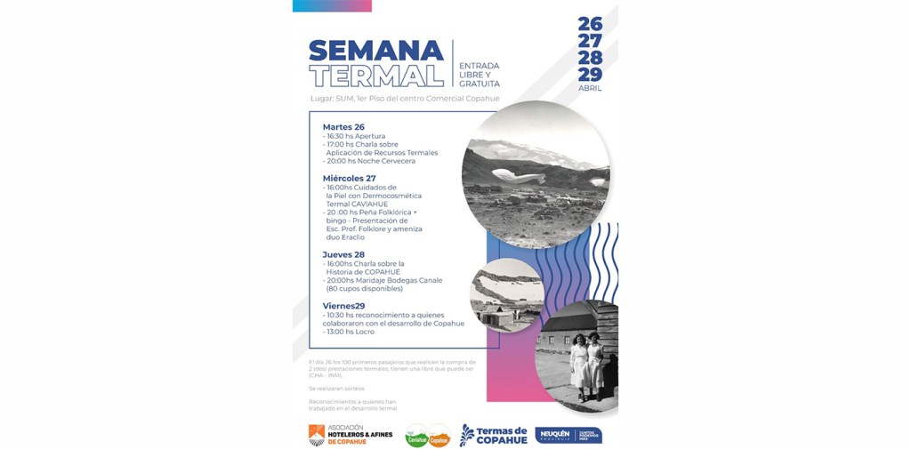 El cronograma de actividades de la Semana Termal será con entrada libre y gratuita, desde el 26 al 29 de abril. Se realizará en el Salón de Usos Múltiples (SUM) de Copahue.