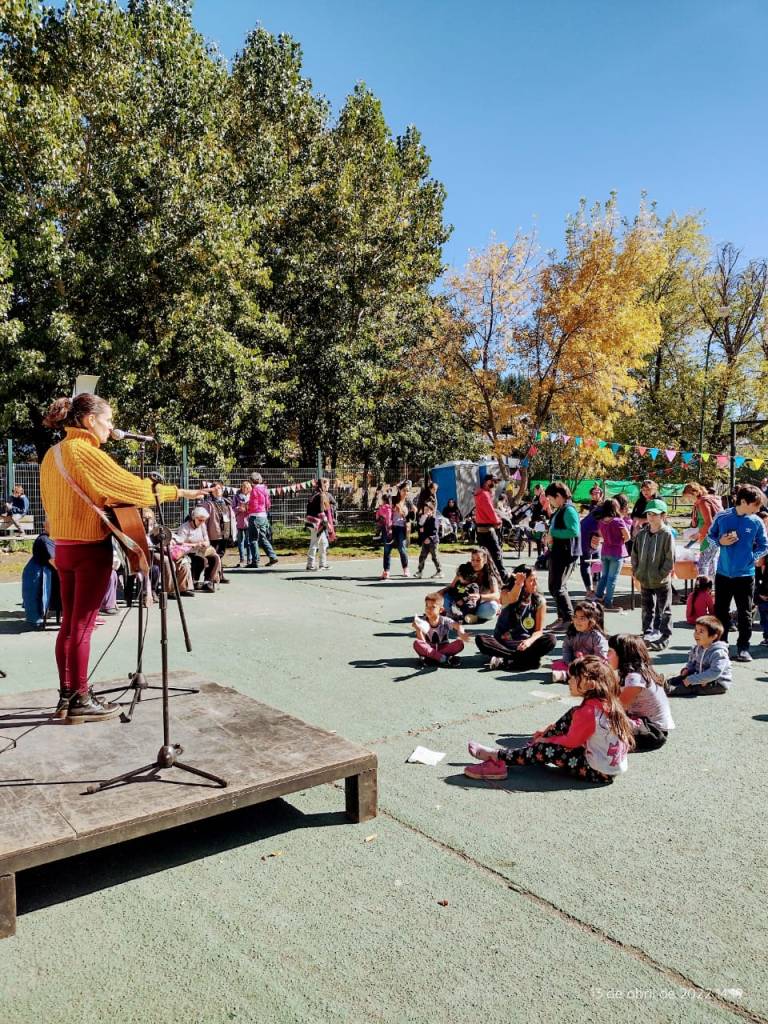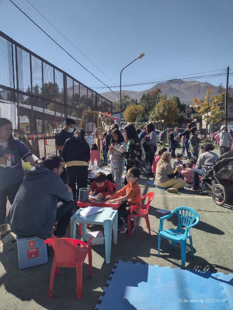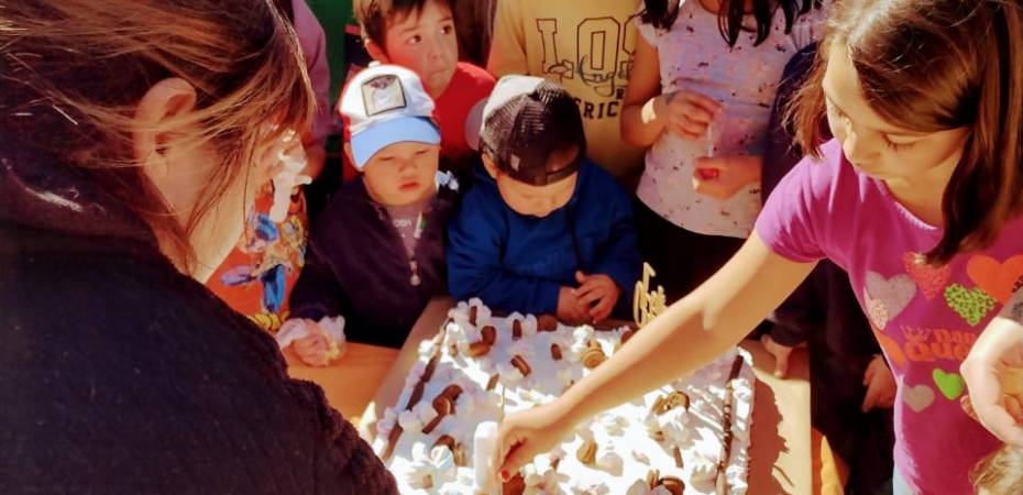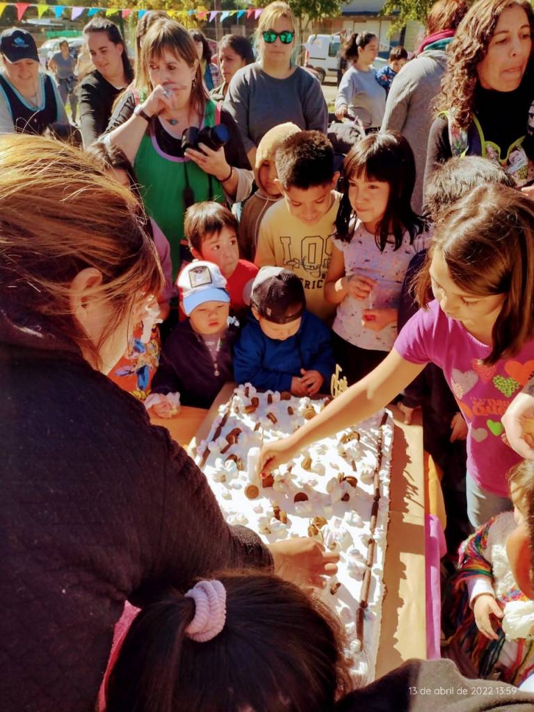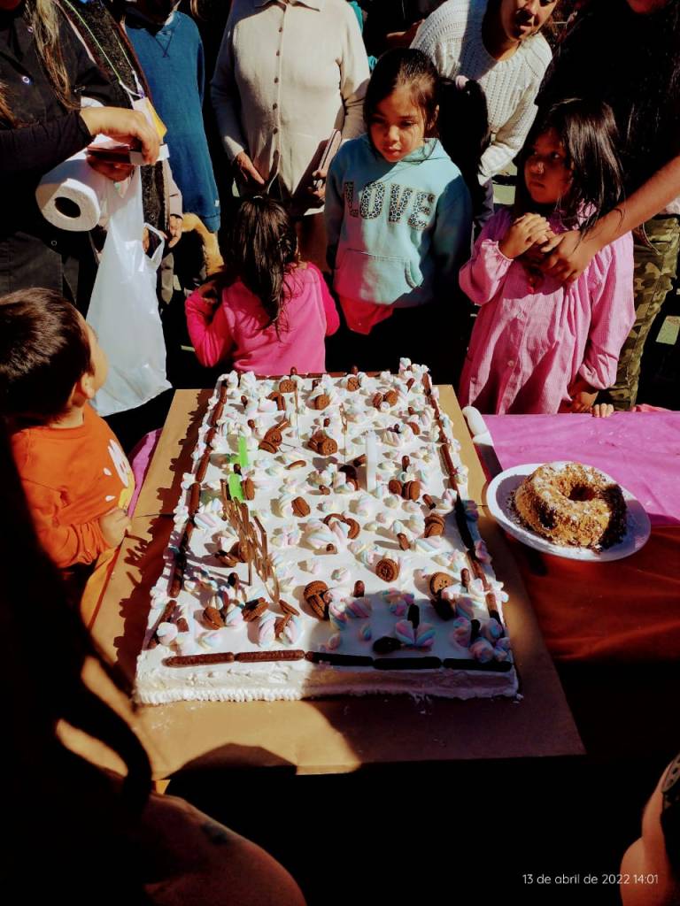 En el playon de la calle Primeros Pobladores, en pleno corazón del barrio Mallin, no faltaron risas, juegos, música, cosas ricas para compartir y hasta la torta “gigante” que fue rodeada por todos los niños y sus docentes para cantar una canción de feliz cumple especial.