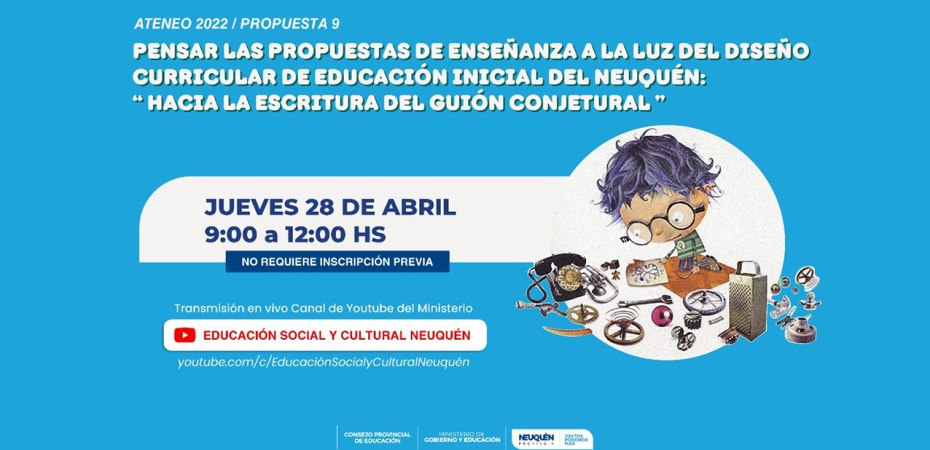 El ministerio de Gobierno y Educación y el Consejo Provincial de Educación (CPE) invitan a Jardines de Infantes de gestión pública y privada, Salas de Educación Inicial en Escuelas Primarias e Institutos de Formación Docente a participar del Ateneo de Praxis «Hacia la escritura del Guión Conjetural» que se realizará el 28 de abril de 9 a 12hs.
