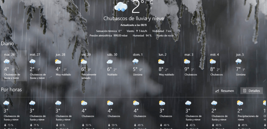 Arrancamos este martes 26 de Abril con todo!!! Con chubascos de lluvia y nieve pronosticados para la jornada de hoy bajo el viento que sopla desde el norte a solo 5 km/h, la temperatura en estos momentos es de 2 grados y la térmica cercana a los 0 grados, la presión atmosférica de 999 mbar y la humedad del 94% hacen que estén dadas todas las condiciones para caer algo de nieve.