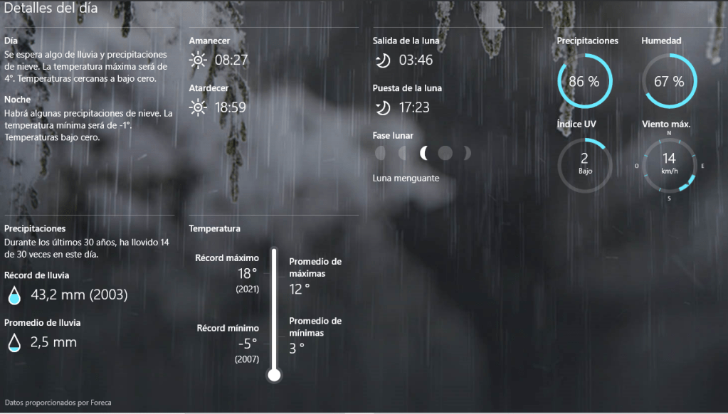 Para la biblioteca decimos que en los últimos 30 años llovió 14 veces y que en el 2003 43.2 mm fue la marca más alta de lluvia caída. En cambio la temperatura más alta registrada para un día como hoy fue en el año 2021 con 18 grados, la mínima se registró el 26 de Abril de 2007 y llego a marcar -5 grados en el termómetro.