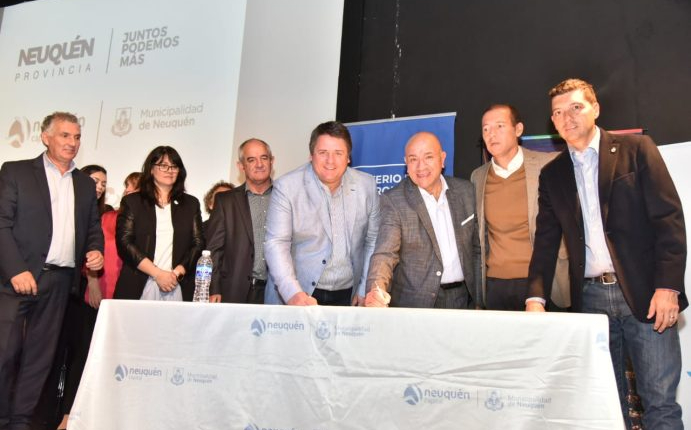 El intendente de Neuquen Capital Mariano Gaido, el gobernador Omar Gutiérrez y el presidente de Calf, Darío Lucca, junto al vicegobernador Marcos Koopmann, firmaron esta mañana un convenio a través del cual 42 instituciones deportivas de la ciudad dejarán de pagar la tarifa de la energía eléctrica.