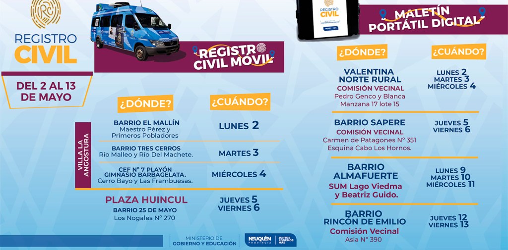 “El jueves 5 y viernes 6 de mayo el Registro Civil Móvil se traslada hacia Plaza Huincul para completar la atención en el Corredor Petrolero, va a funcionar en el barrio 25 de mayo en la calle Los Nogales Nº 270 en la esquina de la calle Islas Malvinas” manifestó Núñez.