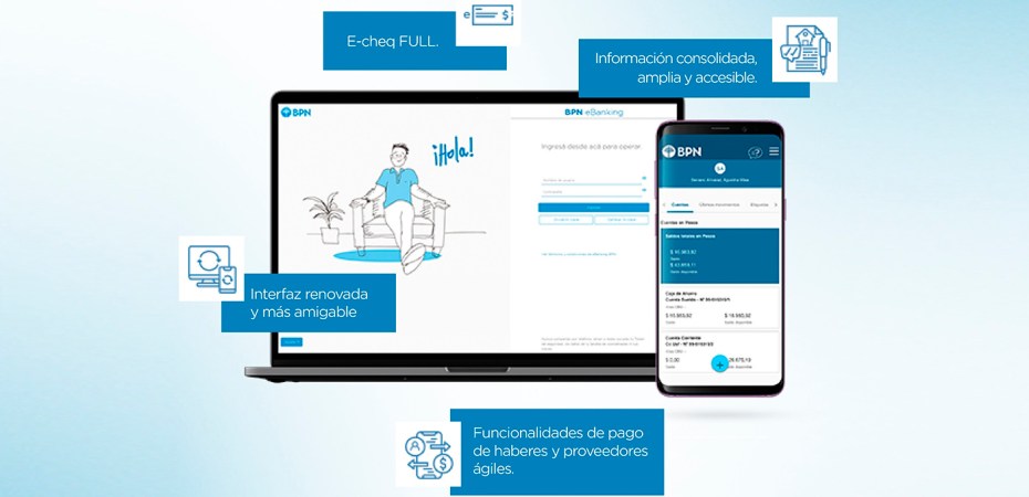 El nuevo eBanking BPN permite a las empresas administrar echeqs (cheques electrónicos) y diversas operaciones, como funcionalidades relacionadas al pago de haberes y proveedores, o de liquidación de acuerdo en cuenta corriente de forma automática, entre otras.