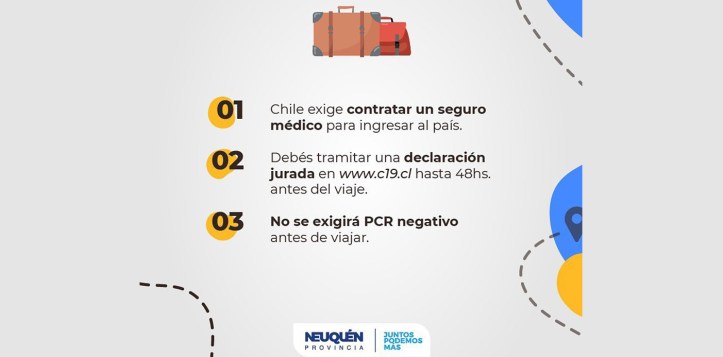 En primer lugar, el país vecino solicita contratar un seguro médico para ingresar al país. Además se deberá tramitar una declaración jurada en el sitio web www.c19.cl hasta 48 horas antes del viaje, pero no se exigirá PCR negativo.