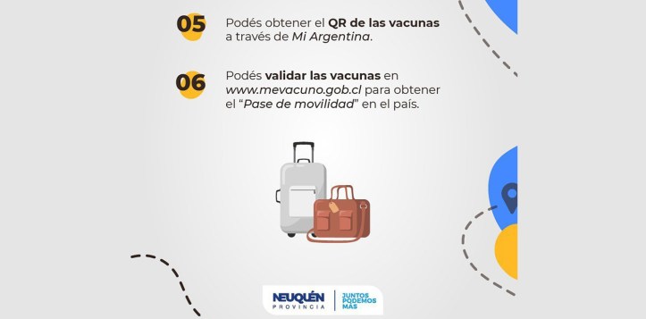Para obtener el código QR de las vacunas se podrá acceder a la aplicación Mi Argentina (www.argentina.gob.ar/miargentina/app), y validar la información de las inoculaciones en el sitio www.mevacuno.gob.cl para adquirir el “pase de movilidad”.