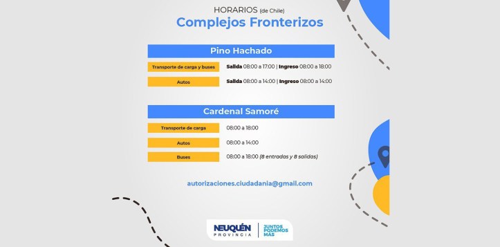 Los horarios de los pasos fronterizos son los siguientes: en Pino Hachado el transporte de cargas y buses, salida de 8 a 17 e ingreso de 8 a 18. Y automóviles, salida de 8 a 14 e ingreso de 8 a 14.