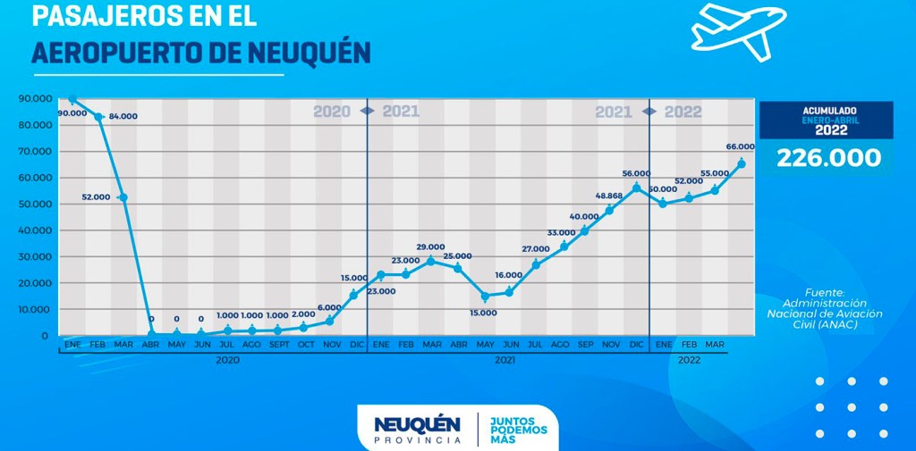 En abril fueron 66.000 los pasajeros que pasaron por el aeropuerto de Neuquén capital, 10.000 más que en marzo pasado. Además, el acumulado enero-abril de este año llegó a las 226.000 personas transportadas, igual que el mismo lapso de 2020. En 2019, en los primeros cuatro meses del año se transportaron 339.000 pasajeros; y 100.000 en 2021.