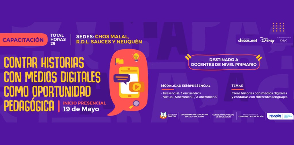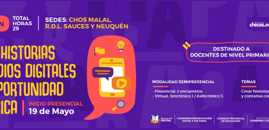 El ministerio de Gobierno y Educación y el Consejo Provincial de Educación (CPE) invitan a docentes de Educación Primaria a ser parte de la capacitación “Contar historias con medios digitales como oportunidad pedagógica”, que se dictará con modalidad semipresencial en tres sedes: Rincón de los Sauces, Neuquén capital y Chos Malal.