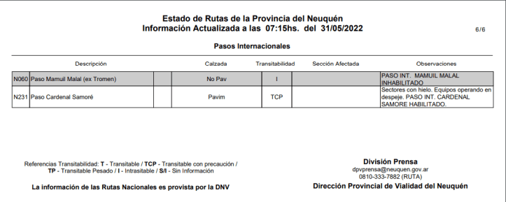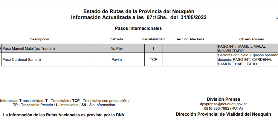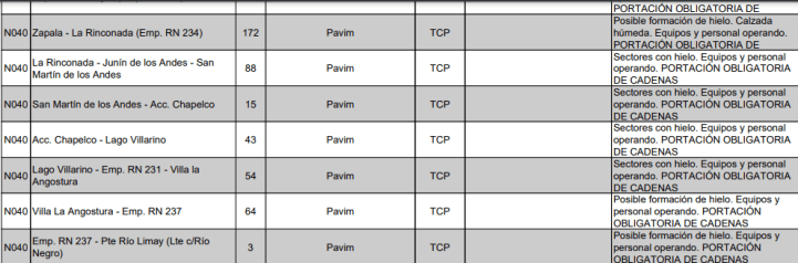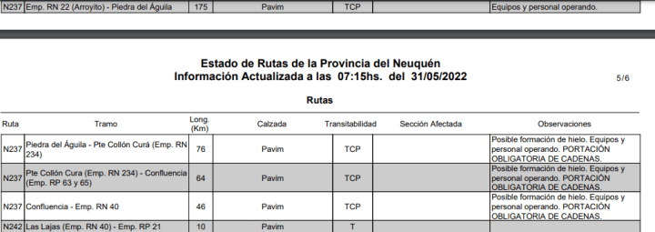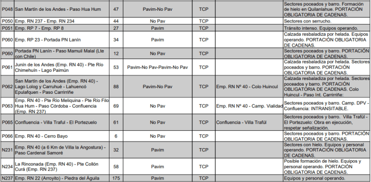 Vialidad provincial comparte el estado de rutas de la region, Todas Transitables, la mayoría con precaución por hielo en calzada y obligación de portar cadenas.