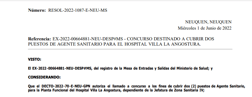 Desde el ministerio de Salud de la provincia de Neuquen publicaron la resolución firmada por la ministra Peve, donde se llama al concurso para cubrir los dos cargos de agente sanitario para la la Planta Funcional del Hospital Villa La Angostura.