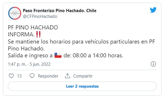 Solo el paso de Icalma en villa Pehuenia tiene horario completo para vehículos particulares, El resto de los pasos en la provincia, incluyendo Pino Hachado mantienen los horarios reducidos de 8 a 14 hs para particulares.