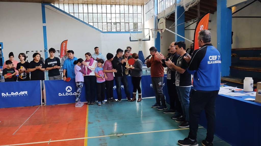 Para ello se dispuso una mesa en el centro del gimnasio, paralizando todo el torneo y con la interpretación musical con guitarra del profesor y deportista de tenis de mesa Mario Daniel Ducos se vivió un emotivo momento ya que mientras sonaba la guitarra se escuchaba el repiqueteo de las pelotas donde dos exponentes del tenis de mesa iban con su peloteo al compás de la música.