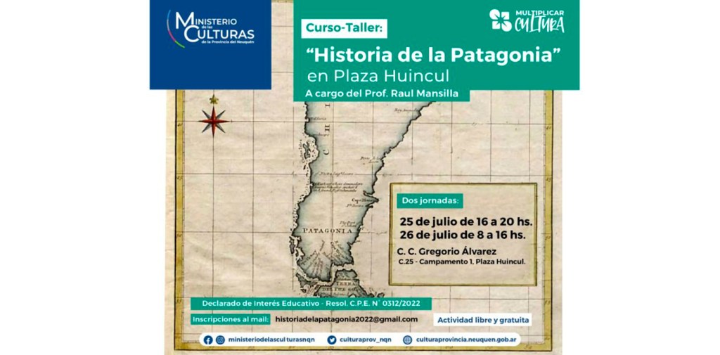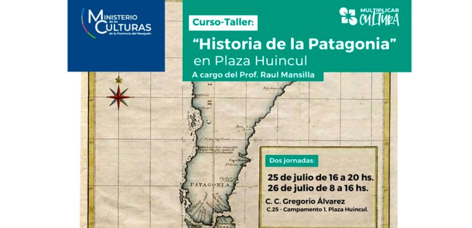 Los días 25 y 26 de julio se realizará nuevamente el curso-taller sobre «Historia de la Patagonia», organizado por el Ministerio de las Culturas. En esta oportunidad, será en la localidad de Plaza Huincul y consistirá en dos encuentros a desarrollarse el 25 de julio de 16 a 20 horas y el 26 de julio de 8 a 16 horas.