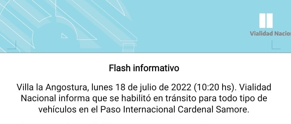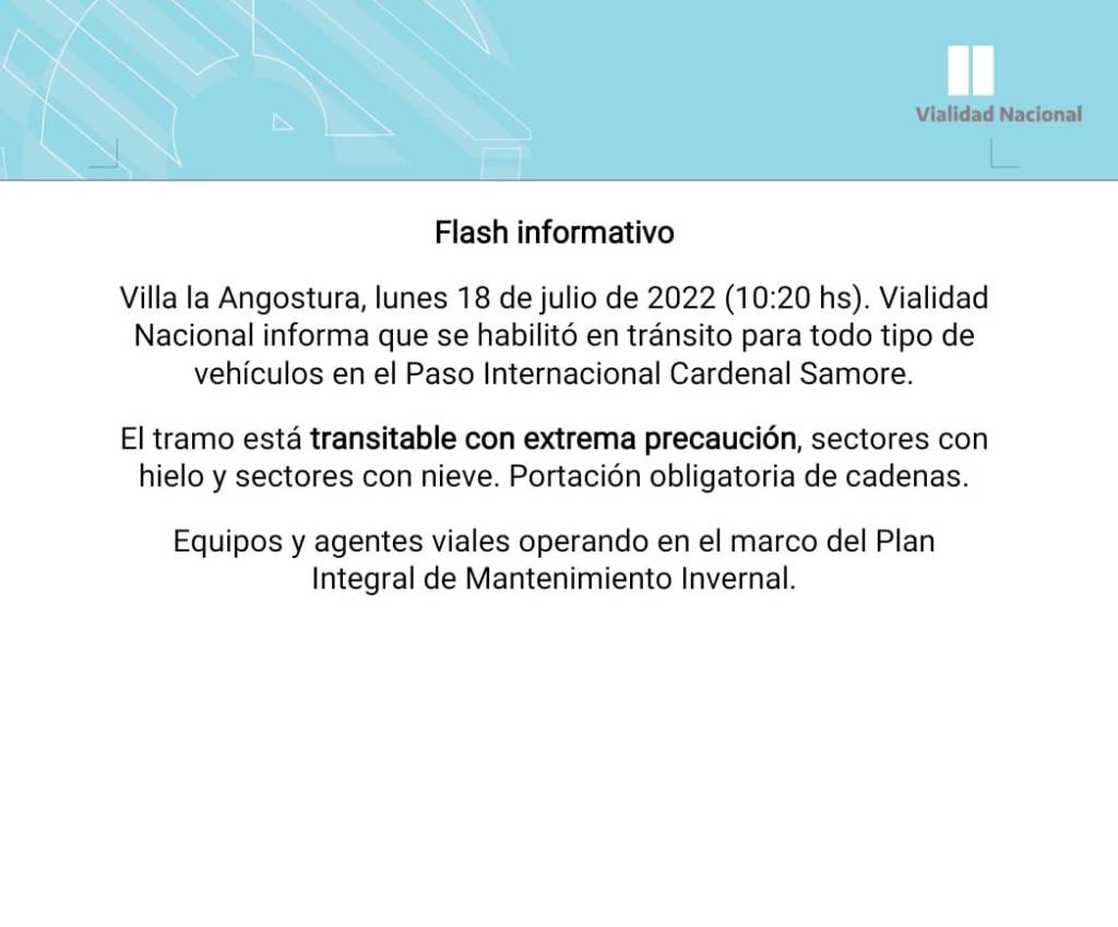 Se habilito el transito para todo tipo de vehículos en Cardenal Samore, transitable con extrema precaución es lo que informa vialidad en su flash informativo.