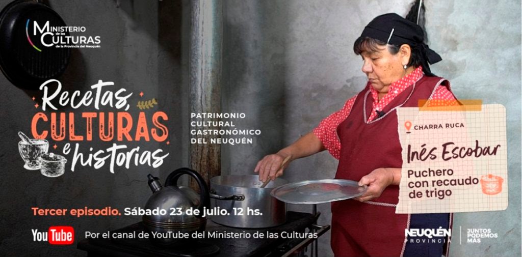 El sábado 23 de julio, a las 12, se estrena el tercer episodio del ciclo gastronómico Recetas, Culturas e Historias, en colaboración con el colectivo Promotoras Culturales en el canal de Youtube del ministerio de las Culturas. En esta ocasión, Inés Escobar, del paraje Charra Ruca, cocinará puchero con recaudo de trigo.