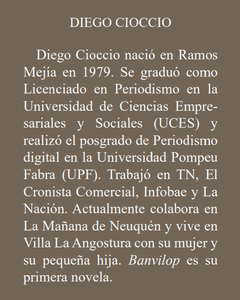Diego Cioccio nació en Ramos Mejía en 1979. Se graduó como Licenciado en Periodismo en la Universidad de Ciencias Empresariales y Sociales (UCES) y realizó el posgrado de Periodismo digital en la Universidad Pompeu Fabra (UPF). Trabajó en TN, El Cronista Comercial, Infobae y La Nación. Actualmente colabora en La Mañana de Neuquén y vive en Villa La Angostura (Neuquén) junto a su mujer y su pequeña hija. Banvilop es su primera novela.