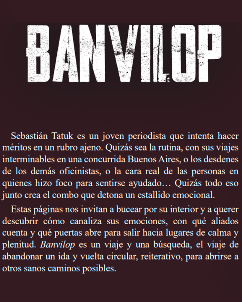 ¿De qué se trata la novela? Banvilop es una novela vivencial que narra el día a día de Sebastián Tatuk, un joven profesional que busca hacer méritos en un rubro ajeno. Sin embargo, la rutina lo apesadumbra y, tras haber tocado fondo, busca salir de ese infierno emocional en el que se encuentra.