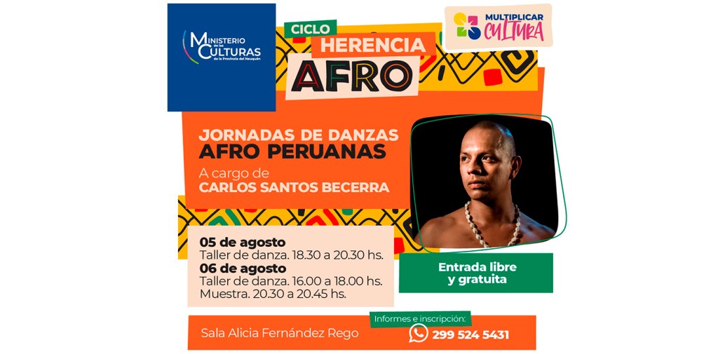 El ministerio de las Culturas invita a las dos Jornadas de Danzas Afro Peruanas a realizarse los días viernes 5 y sábado 6 de agosto a cargo del maestro Carlos Santos Becerra, artista del Perú. Las mismas finalizarán con una muestra y habrá además un conversatorio con la temática “Afrodescendencia de nuestro territorio y de todo el territorio latinoamericano”.