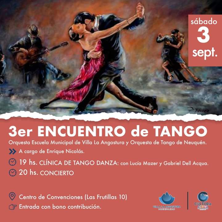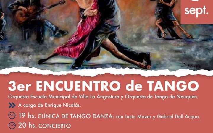 El próximo sábado 3 de septiembre tendrá lugar el Tercer Encuentro de Tango en Villa la Angostura , organizado por la Subsecretaría de Cultura, dependiente de la Secretaría de Gobierno Municipal.