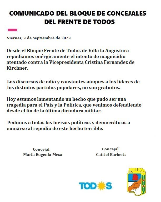 2 de septiembre, 20222 de septiembre, 2022 Opinión a Diario Concejales del FDT de Villa la Angostura, en un comunicado repudian el Atentado a Cristina. Piden que se sumen el resto de las fuerzas políticas. Comunicado Textual. Relacionado