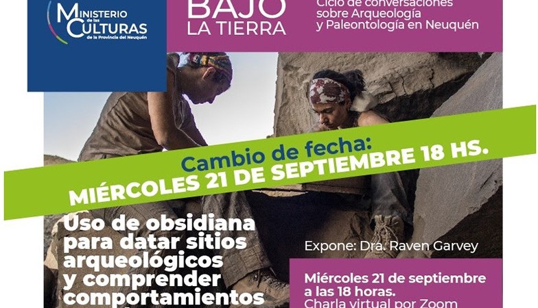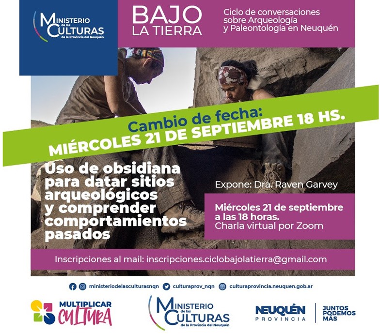 El miércoles 21 de septiembre, a las 18, se realizará una nueva charla virtual del ciclo “Bajo la Tierra. Conversaciones sobre Arqueología y Paleontología en Neuquén”. En esa oportunidad la especialista arqueóloga Raven Garvey expondrá acerca de “Uso de obsidiana para datar sitios arqueológicos y comprender comportamientos pasados”. La fecha original era el miércoles 7, pero fue reprogramada.