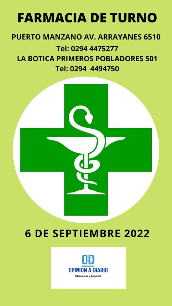 6 de septiembre, 2022 Opinión a Diario Farmacia de turno para hoy, Martes 6 de Septiembre, en Villa la Angostura, Neuquen. Relacionado