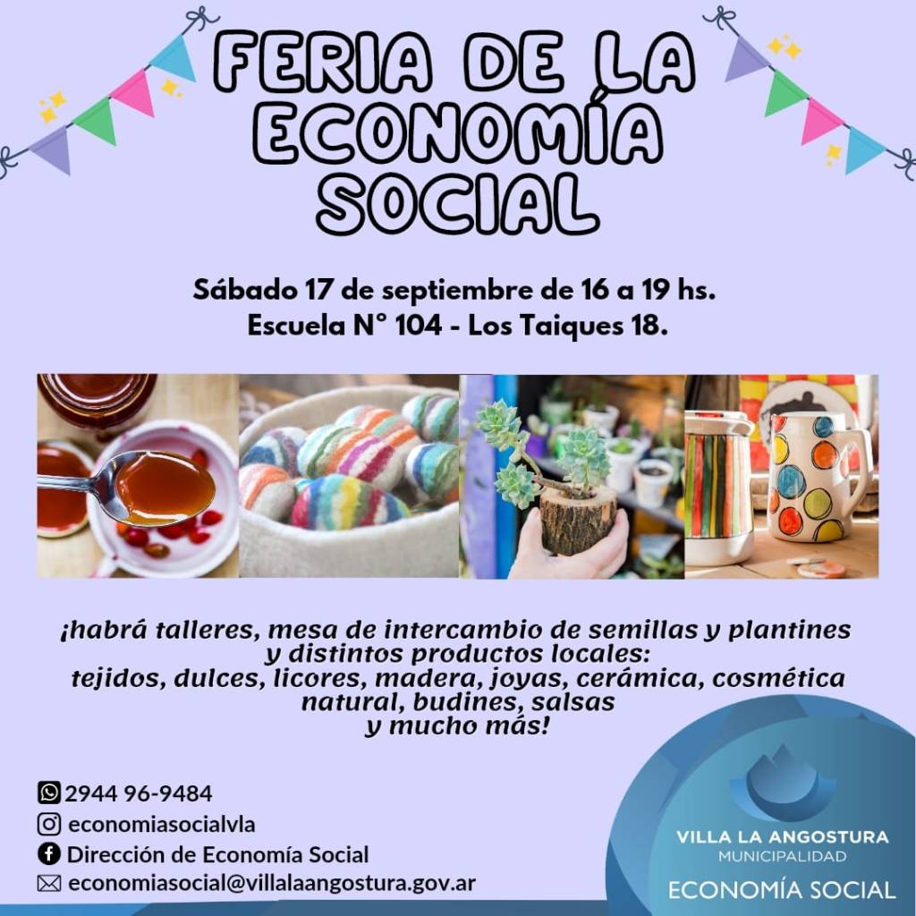 La feria, que se realizara el próximo Sábado desde las 16 horas en al escuela 104, intenta reunir según el Área de Economía Social de Angostura, a todos los «vecinos que realizan artesanías de todo tipo, productores, manualistas y recicladores tengan la oportunidad de medir la demanda y ajustarla a la oferta local, en una instancia presencial«