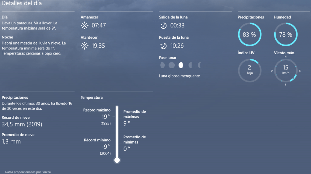 Como dato estadístico para un día como hoy, en los últimos 30 años, Llovió o nevó 16 veces, esta fecha, siendo el año 2019 cuando más nieve acumulo.