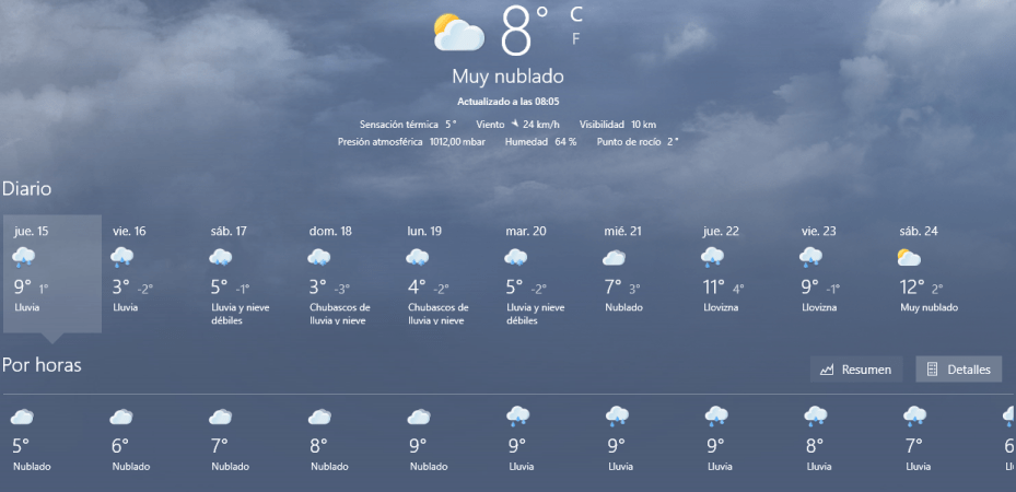 Una mañana inestable desde el punto de vista de la lluvia, amaneciendo con una temperatura que se acerca a los 8 grados y una térmica de 5 grados, Las ráfagas del viento desde el NO soplan hasta los 24 km/h.