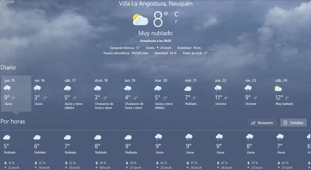 LA máxima para hoy esta pronosticada en 10 grados, y según los porcentajes de lluvia lloverá prácticamente toda la jornada, hasta pasado el mediodía, lloviznas y alguna lluvia aislada, luego ya el pronóstico nos marca agua para toda la tarde.