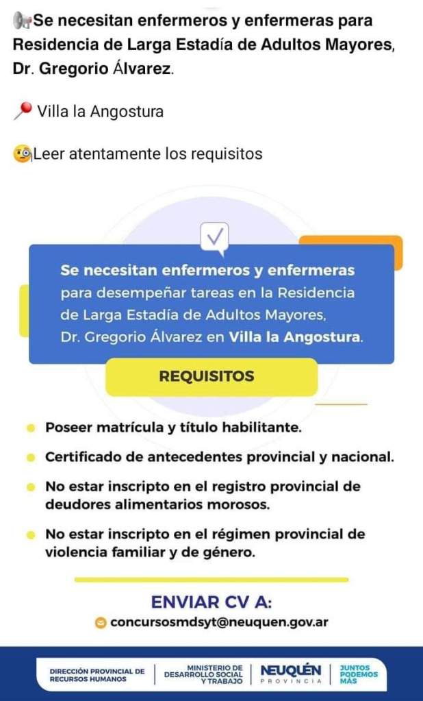 16 de septiembre, 202221 de septiembre, 2022 Opinión a Diario Provincia convoca a enfermeros y enfermeras para el hogar de ancianos de Angostura. Adjuntamos la información para presentar por mail a los cargos. Los postulantes deben cumplir TODOS los requisitos. Relacionado