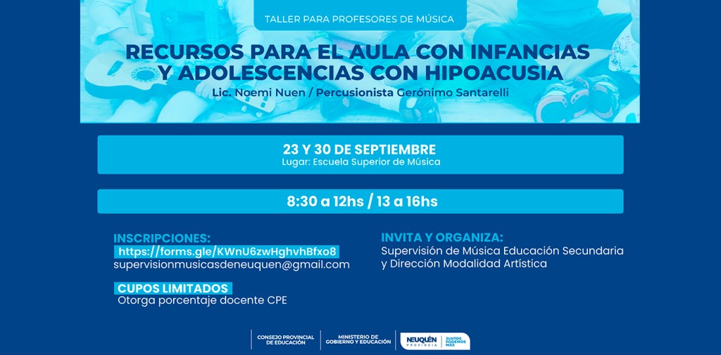 La actividad es llevada adelante por la Dirección Modalidad Artística y la Supervisión de Música Nivel Medio de Neuquén y se realizará los días 23 y 30 de septiembre en la Escuela Superior de Música. Está destinada a profesores y profesoras de música de Educación Inicial, Primaria y Media; y, estudiantes de escuelas superiores que cursen Didáctica de la Música, Talleres de Práctica y Residencias.