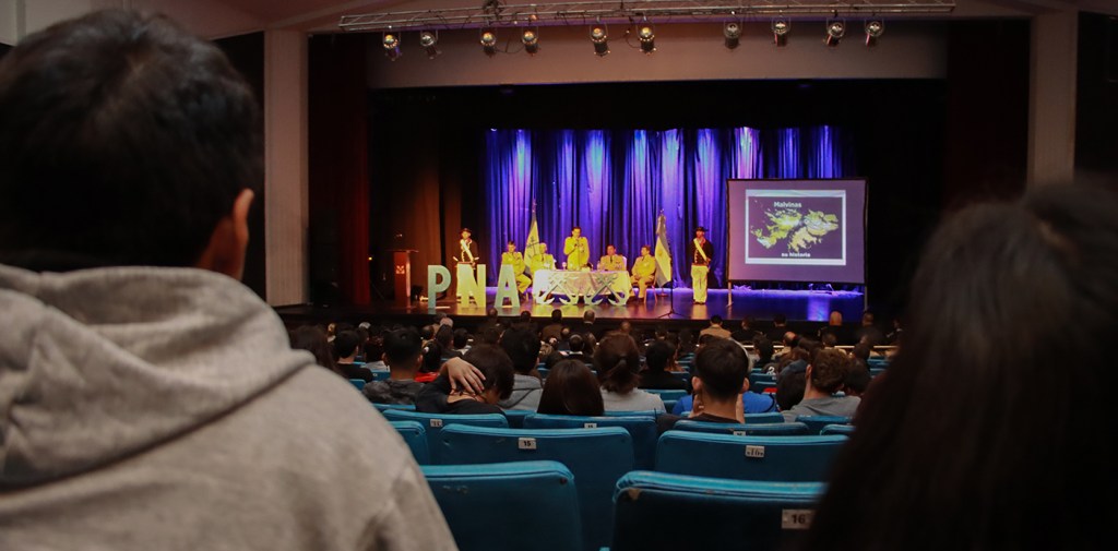 En el año del 40° aniversario de la Gesta de Malvinas y en el mes aniversario de la ciudad de Neuquén, se realizó un conversatorio que recupera el relato de ex combatientes de las fuerzas navales. El evento se realizó hoy por la mañana en el Cine Teatro Español y contó con la participación de unos 400 estudiantes de cuarto, quinto y sexto año de colegios secundarios de Neuquén.