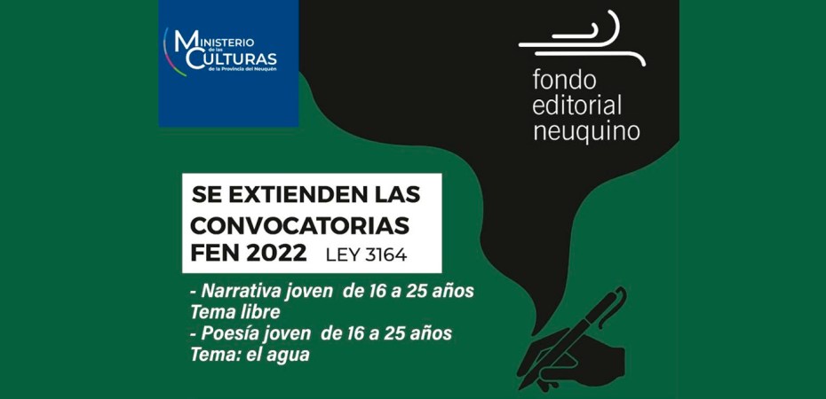 El ministerio de las Culturas informa que se extendió el plazo de recepción de propuestas en el marco de la convocatoria 2022 del Fondo Editorial Neuquino (FEN). La misma comenzó el 30 de junio pasado y se extenderá hasta el 10 de octubre inclusive.