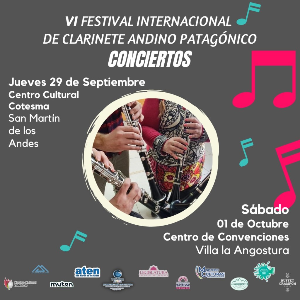 Del 28 de septiembre al 1 de octubre se llevará a cabo el VI FESTIVAL INTERNACIONAL DE CLARINETE ANDINO PATAGÓNICO en las localidades de San Martín de los Andes y Villa la Angostura. Siendo elegida Villa la Angostura como sede para el concierto de cierre de este encuentro.