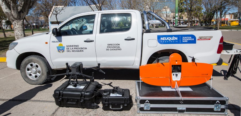 Días atrás, en el estacionamiento del Parque Central de la ciudad de Neuquén, la Dirección Provincial de Catastro junto a todo el personal del organismo, hizo la presentación oficial de los dos drones recientemente adquiridos y de una estación GPS sistema Full GNSS que permite la georreferenciación de las imágenes.